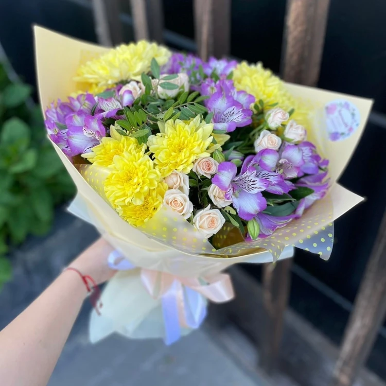 Углубитесь в потрясающий мир красок, представленных в букете "Звездная ночь". Этот букет олицетворяет сладкий нектар жизни, который просыпается в каждом цветке. Микс кустовых роз, кустовых хризантем и альстромерий создает идеальный баланс между нежностью и элегантностью. Прекрасно сбалансированные формы и текстуры цветов вплетаются в романтическую симфонию. Великолепная цветовая гамма этого букета сияет яркими и насыщенными оттенками, заставляя сердца расцветать в волшебном луче света.